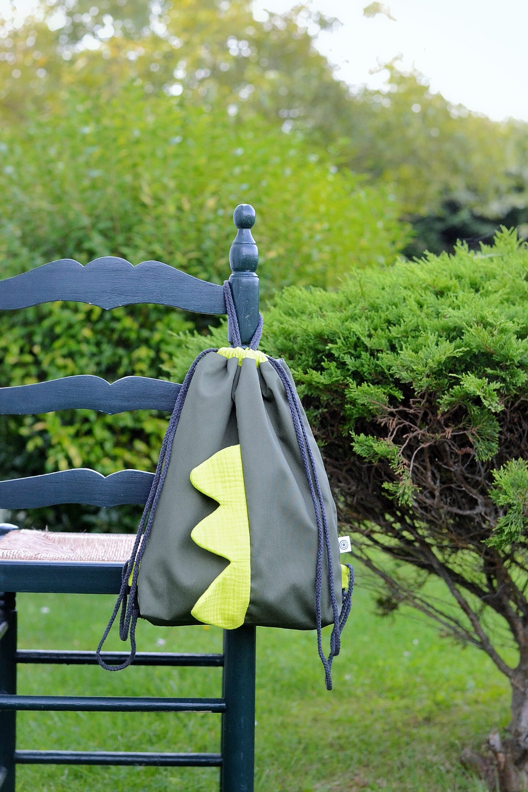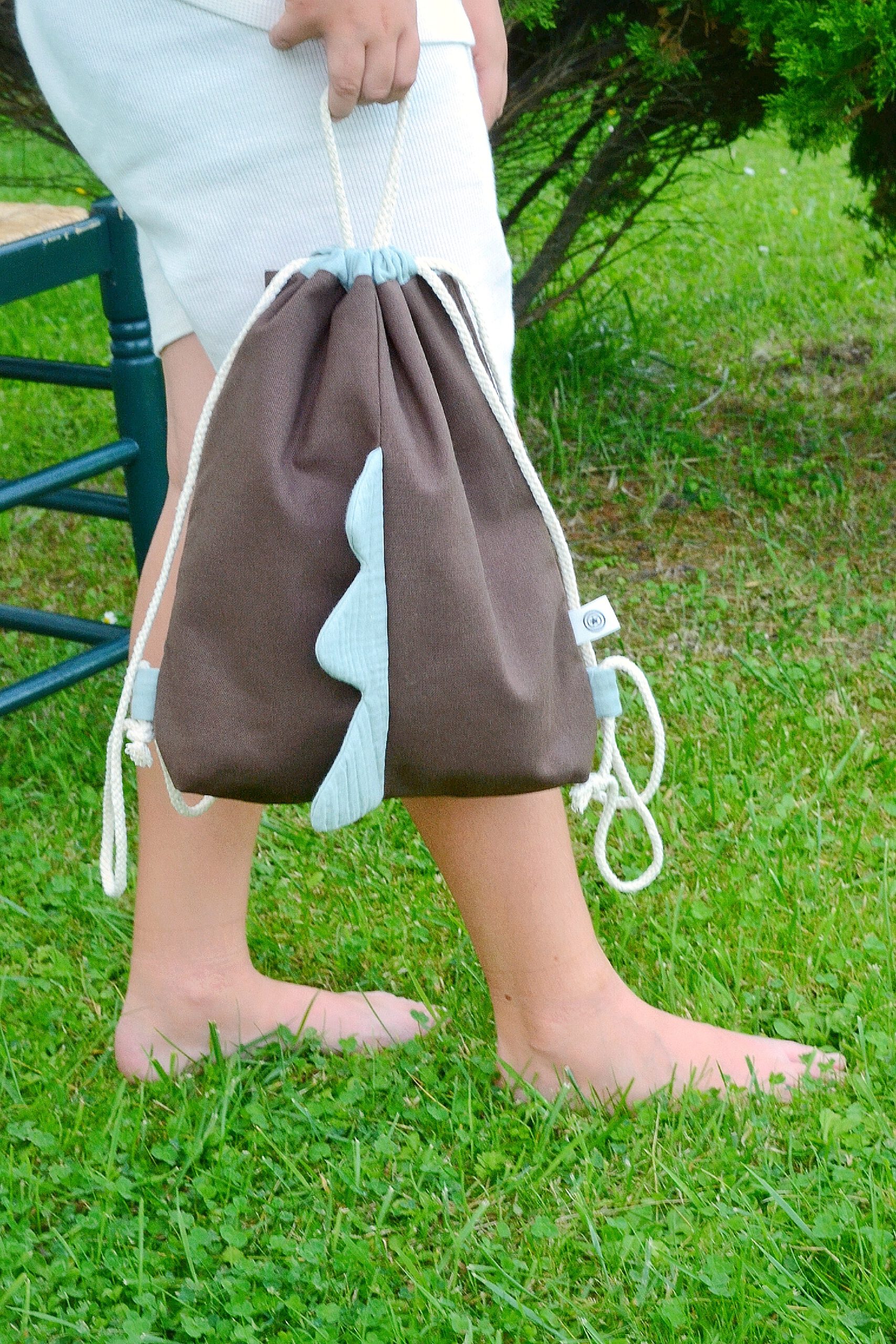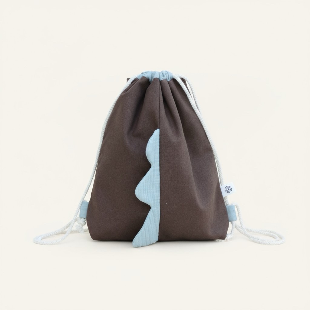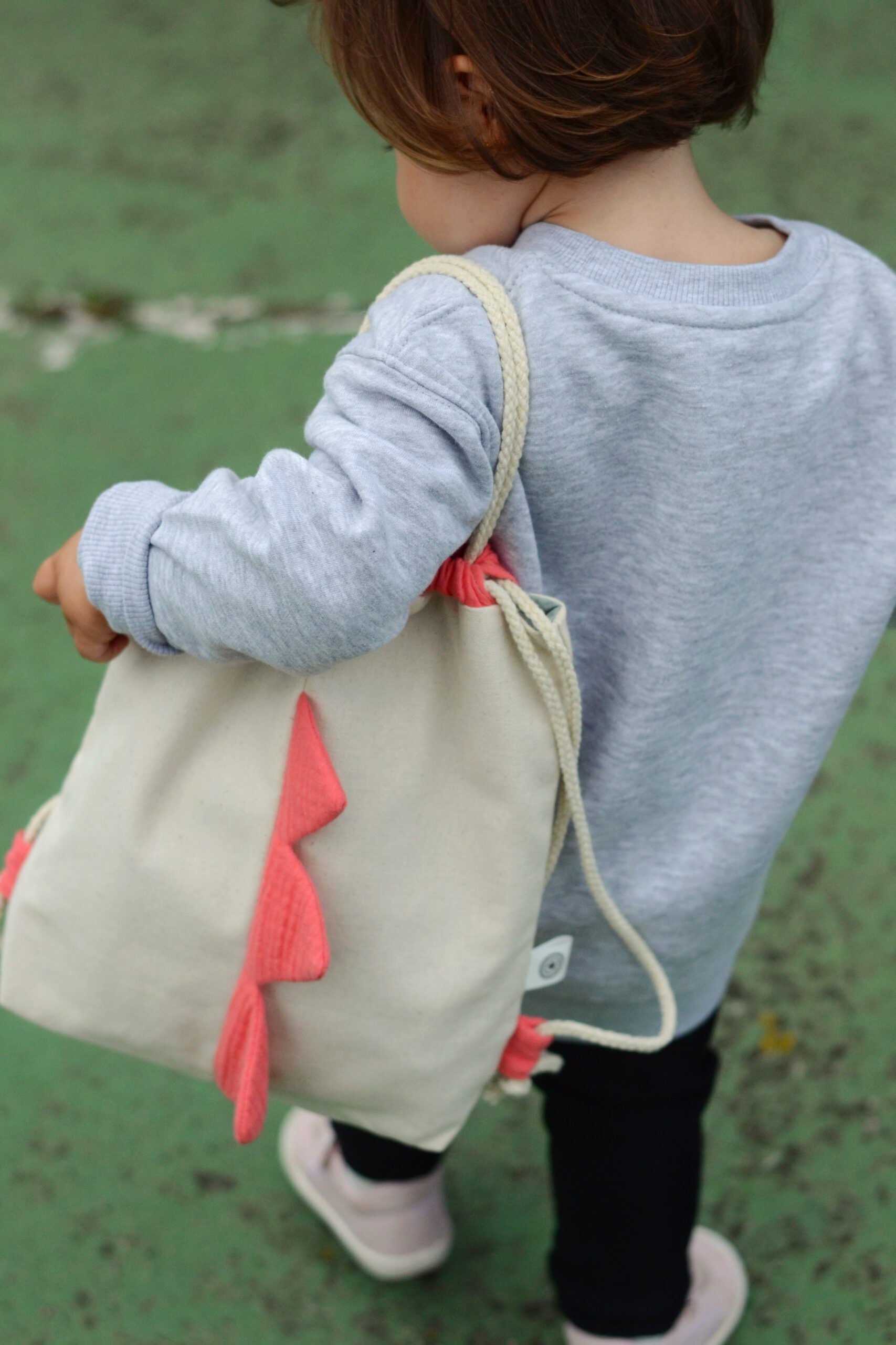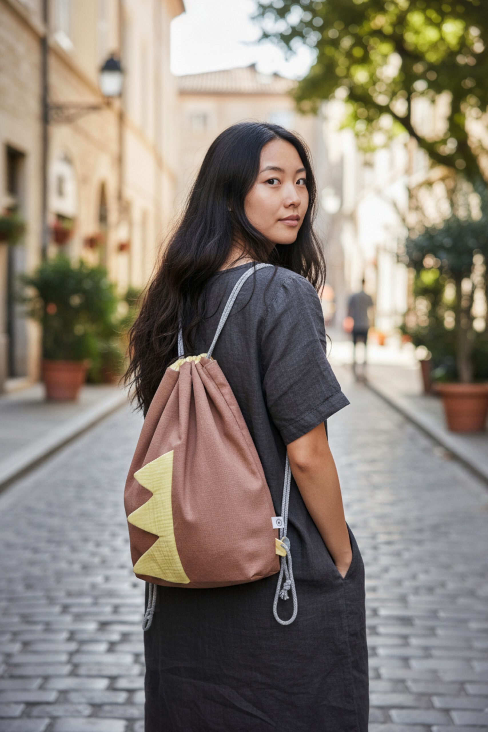 Mochila de algodón con cierre de cordón deslizado, decorada con las características placas dorsales en tela gasa en contraste, la mochila tiene 6 cm de fondo para que quepan un montón de cosas, tiene asas para poder llevarla de la mano en vez de la espalda.