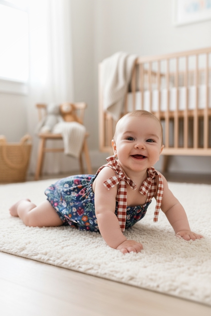Ranita de algodón con tirantes regulables mediante nudo, cuenta con botones automáticos en la parte inferior para facilitar el cambio de pañal.